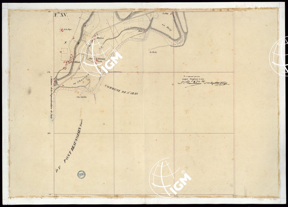 Disegno a penna su carta lucida, probabilmente copia di un disegno originale. La carta si compone di 21 fogli (dei quali i primi 4 in due parti) ed un quadro d’unione per cui complessivamente consta di 26 grandi fogli non totalmente riempiti. E’ riprodotto il corso del Rodano da un punto a circa 2 km. a monte di Anglefort sino alla confluenza del Guiers ed il corso di quest’ultimo sino al Pont Saint Martin poco a monte di Les Echelles. Il disegno è in azzurro per le acque, in rosso per i fabbricati, le dighe, il confine e le misure di riferimento; in nero per la rete stradale, il tratteggio orografico e le scritture. Il Quadro d’Unione alla scala di 1:100.000 porta in calce un elenco di 42 posizioni determinate per le loro coordinate rettangolari riferite alla meridiana ed alla perpendicolare di Parigi in base alle quali è tracciato il reticolato cassiniano della Carta. Documento interessante per la topografia storica dei fiumi rappresentati.