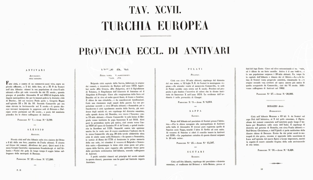 ATLANTE DEL PETRI – Parte II Tavola XCVII -PROVINCIA ECCLESIASTICA DI ANTIVARI E ARCIV.TO DI DURAZZO NELLA TURCHIA EUROPEA