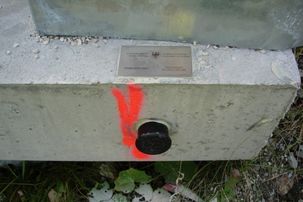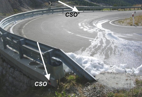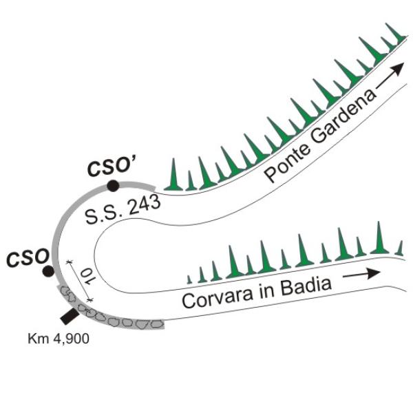 [{"simbolo_contrassegno":"B1","materializzazione":"(CSO) – Bullone infisso sul muro del guard rail a circa 10 m dalla chilimetrica 4,900."},{"simbolo_contrassegno":"B4","materializzazione":"(CSO') – Centrino universale infisso all'inizio del muro del guard rail in prossimit\u00e0 del primo tornate a destra in direzione Corvara in Badia."}]