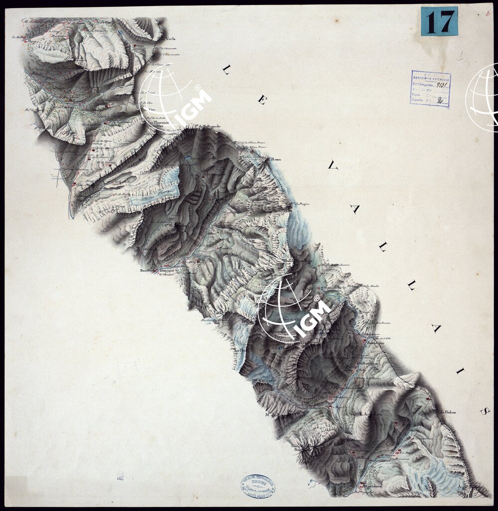 Otto fogli di diverse dimensioni, più due quadri d’unione, rappresentanti una zona lungo la linea di frontiera, per una larghezza variabile tra i 4 e i 10 km. Disegno a penna accuratissimo a più colori, acquerellato per la rappresentazione orografica con molta efficacia artistica. Confrontati con i fogli corrispondenti della Carta degli Stati Sardi al 50.000, si mostrano più ricchi d’indicazioni topografiche e toponomastiche. Segni convenzionali speciali indicanti i Corpi di guardia e i distaccamenti della 1a e 2a linea per le truppe del Cordone Sanitario. Non portano indicazione di autore; ma una registrazione d’Archivio dice che per tradizione di ufficio sono attribuiti al Brambilla.
