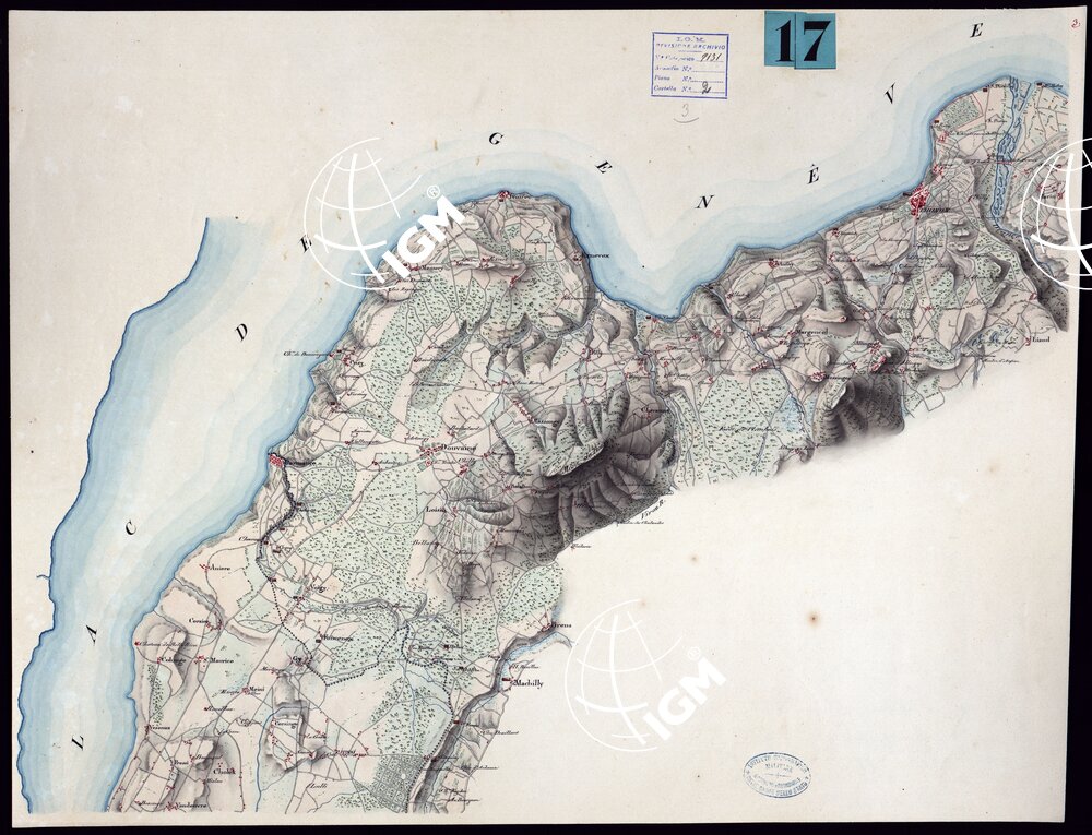 Otto fogli di diverse dimensioni, più due quadri d’unione, rappresentanti una zona lungo la linea di frontiera, per una larghezza variabile tra i 4 e i 10 km. Disegno a penna accuratissimo a più colori, acquerellato per la rappresentazione orografica con molta efficacia artistica. Confrontati con i fogli corrispondenti della Carta degli Stati Sardi al 50.000, si mostrano più ricchi d’indicazioni topografiche e toponomastiche. Segni convenzionali speciali indicanti i Corpi di guardia e i distaccamenti della 1a e 2a linea per le truppe del Cordone Sanitario. Non portano indicazione di autore; ma una registrazione d’Archivio dice che per tradizione di ufficio sono attribuiti al Brambilla.