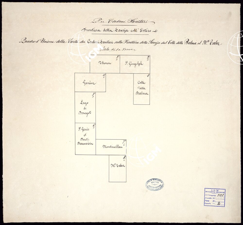 CARTA DEI CORDONI SANITARI SULLA FRONTIERA DELLA SAVOIA DAL COLLE DELLA BALMA AL M.TE TABOR – QUADRO D’UNIONE N.1.