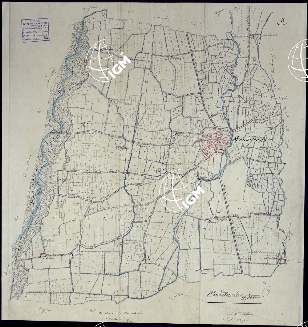 Il titolo non è presente sulla carta. Gruppo di 16 mappe catastali riconosciute sul terreno probabilmente per la costruzione della carta generale degli Stsati Sardi al 50.000. Alcune di esse recano le firme dei Cap.i Basso e Lafleche e del geometra Coda.