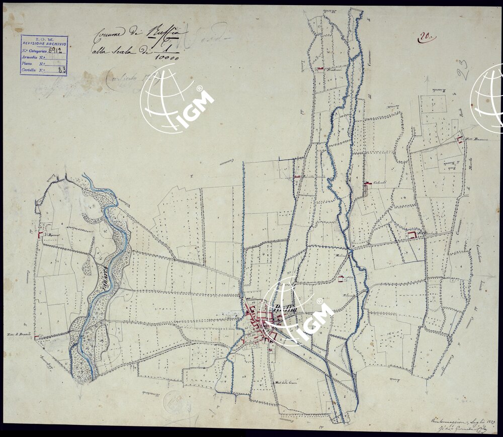 Il titolo non è presente sulla carta. Gruppo di 16 mappe catastali riconosciute sul terreno prebabilmente per la costruzione della carta generale degli Stati Sardi al 50.000. Alcune di esse recano le firme dei Cap.i Basso e LAfleche e del geometra Coda.
