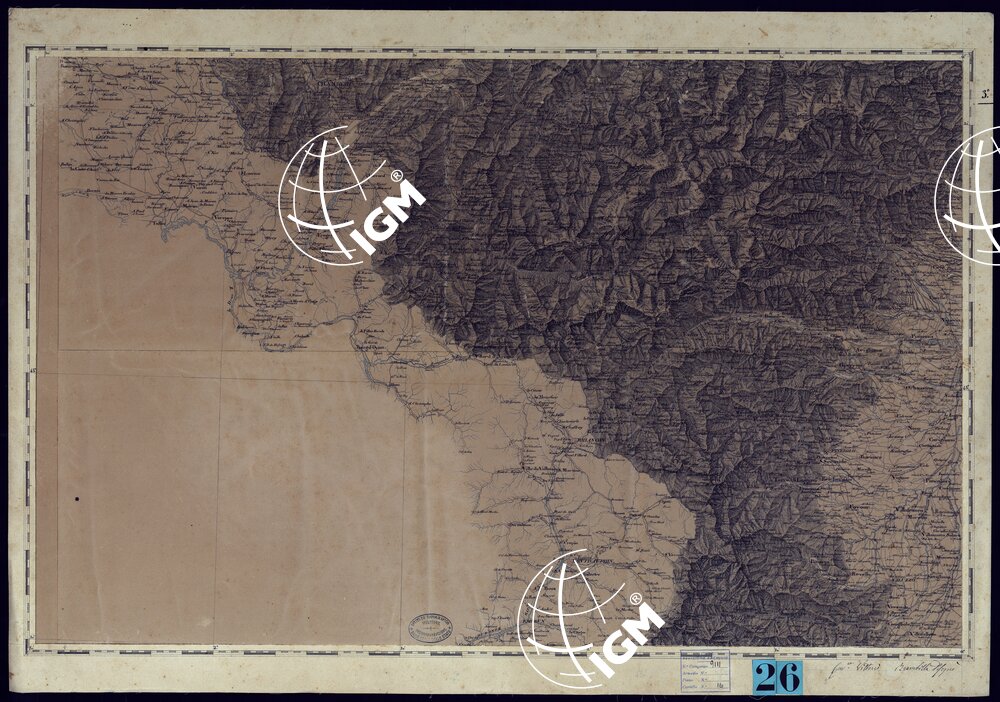 Disegno originale a penna a più colori, in 6 fogli + un supplemento del foglio 6 finemente eseguito e artosticamente tratteggio per la rappresentazione oorografica, che servì di modello per l’incisione su rame della corrispondente carta pubblicata nel 1841. Il disegno è opera dell’Ingegnere Topografo V. Brambilla, che alla pubblicazione di questa carta appunto la sua grande e meritata notorietà.