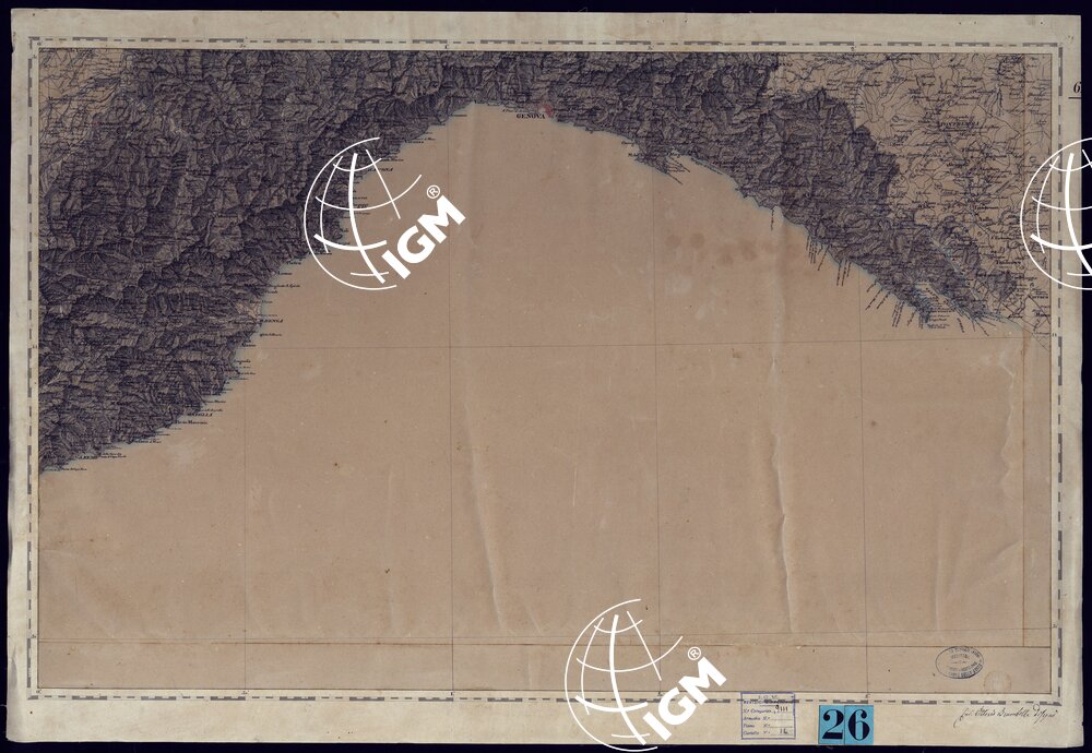 Disegno originale a penna a più colori, in 6 fogli + un supplemento del foglio 6 finemente eseguito e artisticamente tratteggiato per la rappresentazione orografica, che servì di modello per l’incisione su rame della corrispondente carta pubblicata nel 1841. Il disegno è opera dell’Ingegnere Topografo V. Brambilla, che alla pubblicazione di questa carta appunto la sua grande e meritata notorietà.