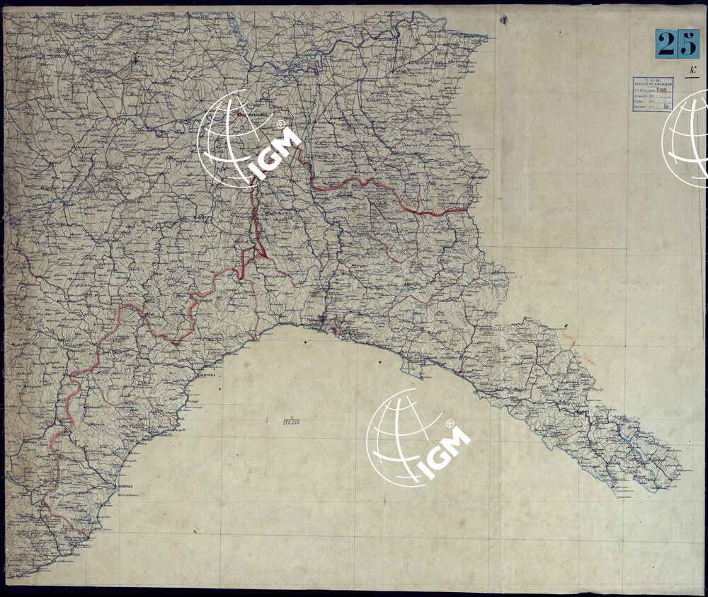 Quattro fogli senza titolo, finemente disegnati a penna, dei quali tre per la sola planimetria e toponomastica e il quarto acquerellato per la rappresentazione dell’orografia. Essi costituiscono le minute per la formazione della corrispondente carta in 6 fogli incisa e pubblicata nel 1841.