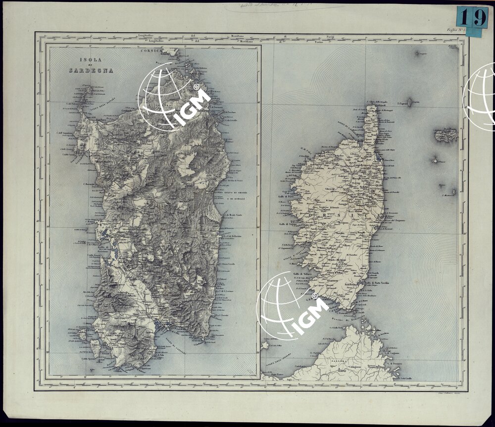 La carta è parte dei sei fogli della Carta Corografica dell’Italia Superiore e Centrale alla scala di 1:600.000 pubblicata dall’Ufficio Superiore di S. M. nel 1865. Incisione del Cattaneo. La metà di sinistra di ciascun foglio è occupata dalla rappresentazione della Sardegna (tratteggio a luce obliqua), la metà di destra dalla rappresentazione planimetrica della Corsica.