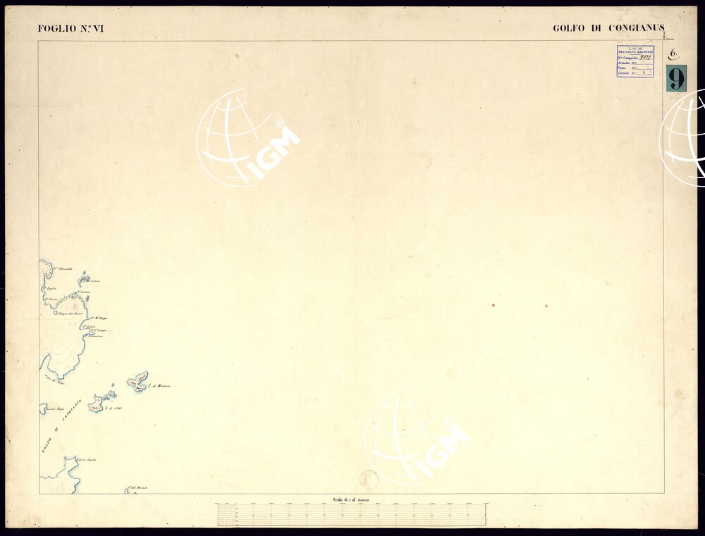 Il documento consta di 47 carte più 4 quadri d’unione ed una tavola descrittiva. La numeraziome delle carte è compresa tra il n. 1 e il n.49, mancano le tavole 17 e 30. La 17 è stata inserita nella 18, mentre la 30 è mancante (Scoglio Catalano).