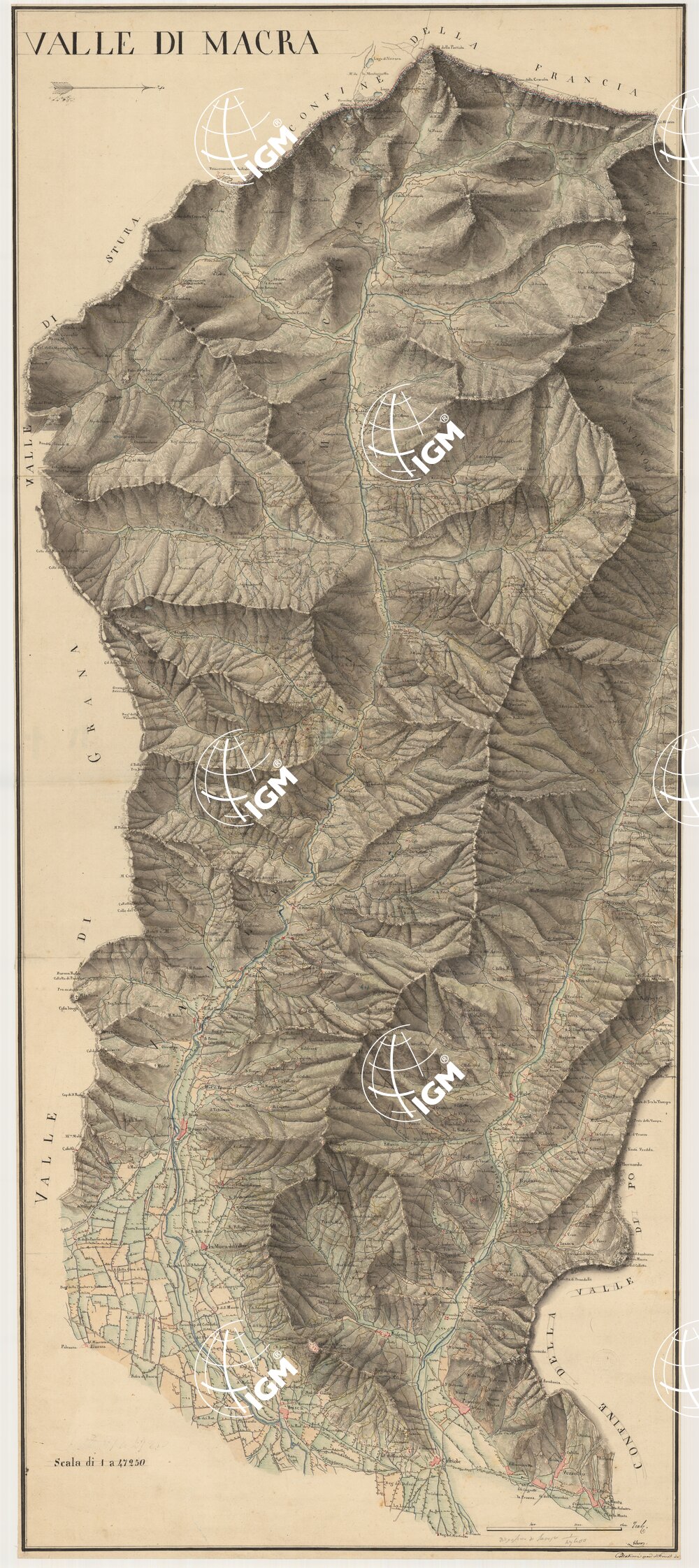 Un foglio con orografia a tratteggio a luce obliqua, abitati in rosso, acque in azzurro, strade in giallo, vegetazioni e colture in verde e in giallino. Disegno ad acquerello assai pregevole, firmato Velasco vistato da L. Denis de… E’ orientato col nord volto verso il lato destro del foglio.