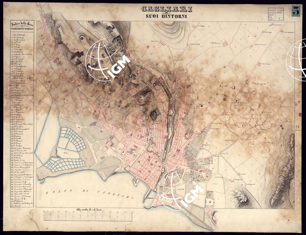 Altra pianta, alquanto detoriata in seguito, pare, ad un incendio avvenuto nell’archivio di Torino ove era conservata. Reca sul margine sinistro un “Indice delle Chiese e Stabilimenti Pubblici”.