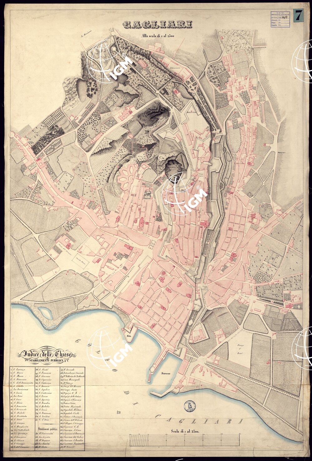 Disegno accuratissimo della pianta della città di Cagliari. In basso a sinistra reca un “Indice delle Chiese e Stabilimenti pubblici”.