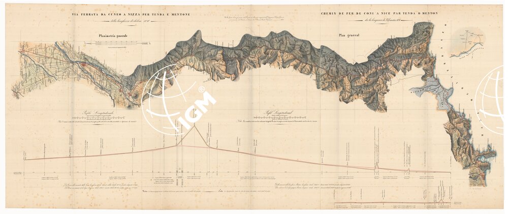 Disegno ad acquerello con orografia a tratteggio sussidiato da sfumo a luce obliqua, idrografia in azzurro, abitati in rosso, rete stradale in tinta derivata dal giallo. Il tracciato della ferrovia è in rosso. La carta fa parte del ” Progetto di massima eseguito dall’Ingegnere Filippo Cerroti per incarico del Sindaco di Cuneo Avv. Brunet Carlo Deputato, 1856″. In basso il profilo longitudinale della ferrovia alle scale di 1:50.000 per le lunghezze e 1:10.000 per le altezze.