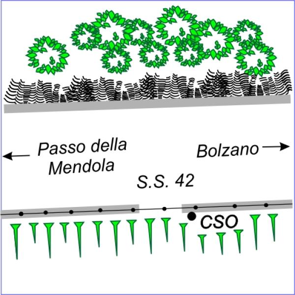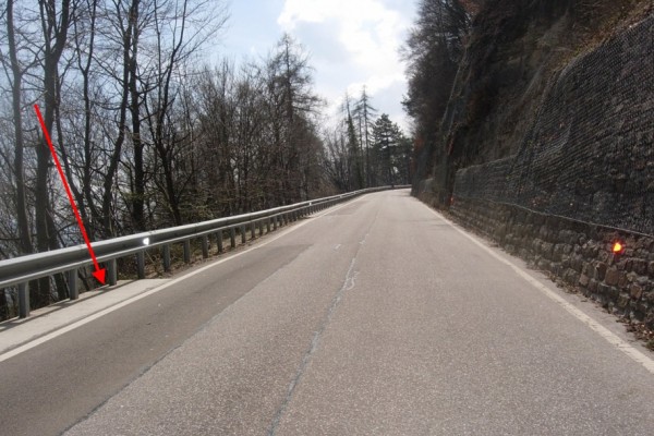 | Contrassegni | [{"simbolo_contrassegno":"B1","materializzazione":"(CSO) – Bullone infisso all'esterno del muro di sostegno del guard-rail, a valle della strada, in prossimit\u00e0 della testata volta verso il Passo della Mendola."}] |