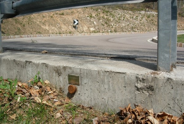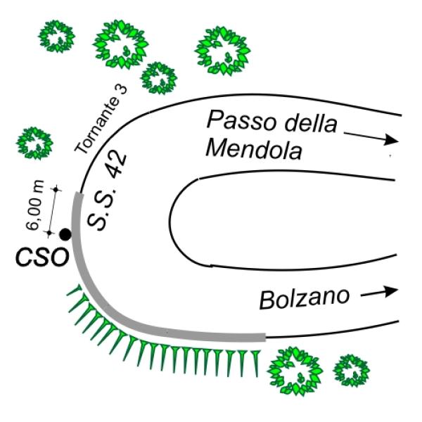 [{"simbolo_contrassegno":"B1","materializzazione":"(CSO) – Bullone infisso in esterno del muro di sostegno del guard-rail a valle della strada, quasi al centro del 3\u00b0 tornante, a 6 m dalla testata volta verso il Passo della Mendola."}]