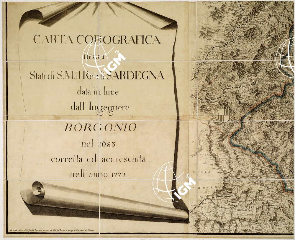 Nuova edizione della così detta “Carta di Madama Reale” costruita dall’ingegnere cartografo G. T. Borgonio disegnatore e calligrafo, addetto fin dal 1650 alla corte Sabauda, e pubblicata nel 1680 in 15 fogli incisi su rame. La carta del Borgonio rappresenta un grande progresso nella cartografia del Piemonte essendo essa di gran lunga superiore alle precedenti produzioni cartografiche di quella regione. Per quanto non poggiata su una vera e propria base geometrica, sì da doverne accusare l’inesattezza nell’orientamento e nella misura delle distanze, essa nondimeno è particolarmente pregevole sia per la ricchezza di informazioni relative agli abitati, strade, corsi d’acqua, sia per la rappresentazione dell’orografia efficacemente dimostrata alla cavaliera. La carta del Borgonio rimase famosa ed apprezzata per circa un secolo e mezzo: ad essa si ispirarono successivi cartografi come il Coronelli, De Fer, Mortier, R. de Vaugondy. Divenuta rarissima se ne pubblicarono nuove edizioni una delle quali a Londra nel 1765 a cura di A. Dury, e l’altra a Torino nel 1772 a cura dell’incisore piemontese Stagnone tratta dagli stessi rami del Borgonio ma corretti ed arricchiti, e con l’aggiunta di nuovi sì da estendere la carta alla Liguria e a parte della Lombardia.
