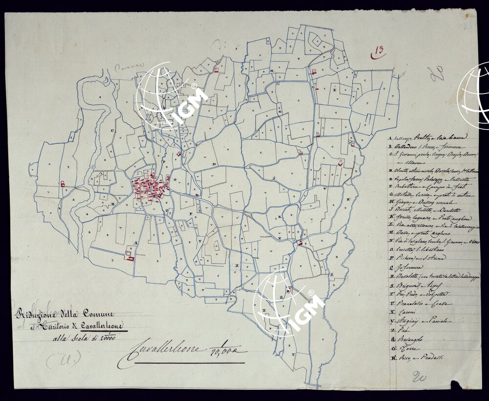 Il titolo non è presente sulla carta. Gruppo di 51 mappe catastali di diversi comuni, impiegate con tutta probabilità per la costruzione della carta generale degli Stati Sardi al 50.000. Senza firma, eccetto due, firmate da Lagrange, una riduzione del piano catastale del territorio d’Ivrea firmato Valsecchi 1822, e una riproduzione dei piani catastali di comuni della provincia d’Ivrea firmata Cap. Roggero.