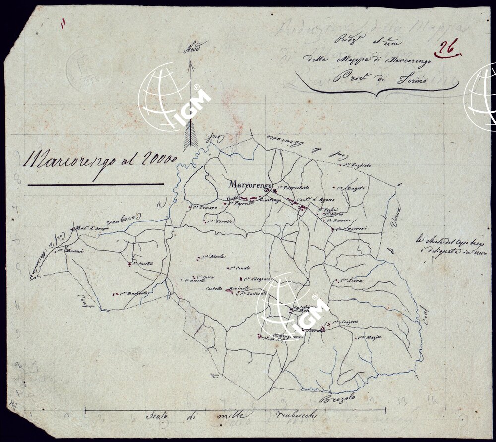 Gruppo di 51 mappe catastali di diversi comuni, impiegate con tutta probabilità per la costruzione della carta generale degli Stati Sardi al 50.000. Senza firma, eccetto due, firmate da Lagrange, una riduzione del piano catastale del territorio d’Ivrea firmato Valsecchi 1822, e una riproduzione dei piani catastali di comuni della provincia d’Ivrea firmata Cap. Roggero.