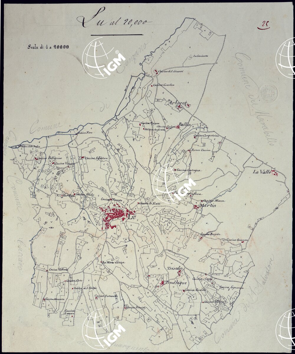 Gruppo di 51 mappe catastali di diversi comuni, impiegate con tutta probabilità per la costruzione della carta generale degli Stati Sardi al 50.000. Senza firma, eccetto due, firmate da Langrange, una riduzione del piano catastale del territorio d’Ivrea firmato Valsecchi 1822, e una riproduzione dei piani catastali di comuni della provincia d’Ivrea firmata Cap. Roggero.