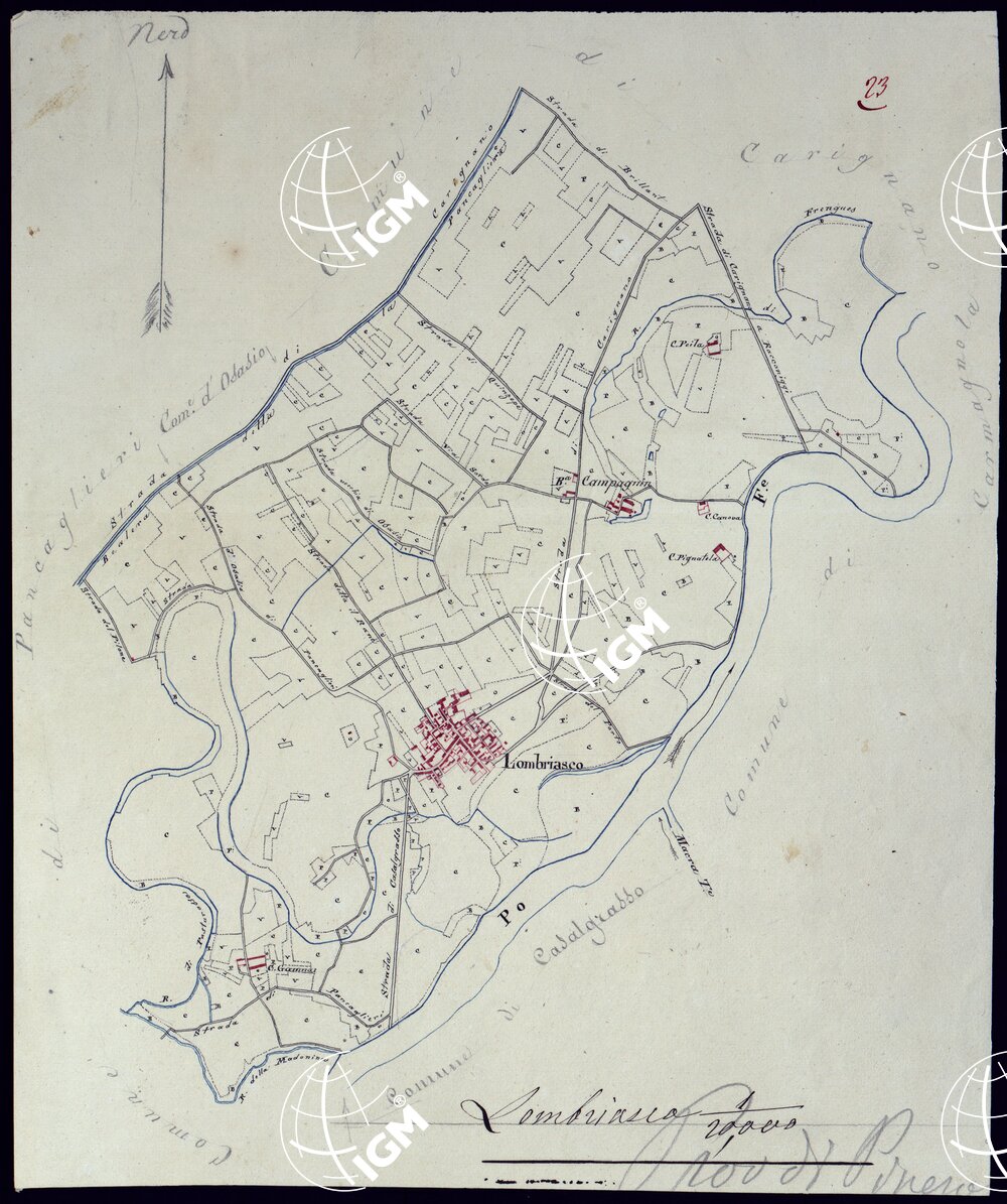 Il titolo non è presente sulla carta. Gruppo di 51 mappe catastali di diversi comuni, impiegate con tutta probabilità per la costruzione della carta generale degli Stati Sardi al 50.000. Senza firma, eccetto due, firmate da Langrange, una riduzione del piano catastale del territorio d’Ivrea firmato Valsecchi 1822, e una riproduzione dei piani catastali di comuni della provincia d’Ivrea firmata Cap. Roggero.