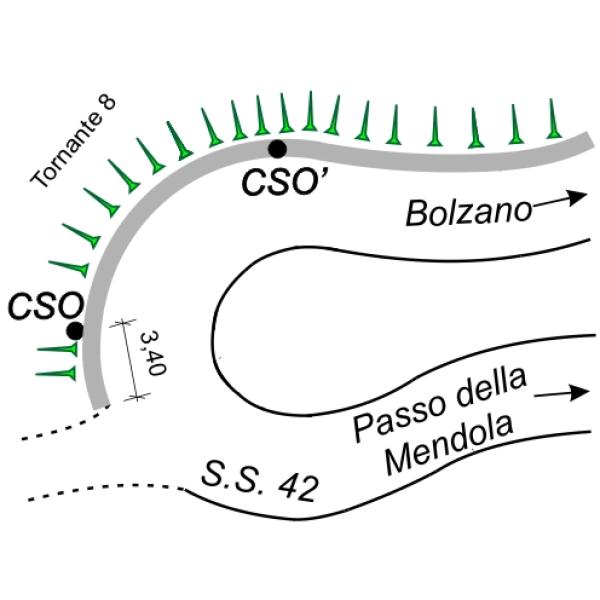 | Contrassegni | [{"simbolo_contrassegno":"B1","materializzazione":"(CSO) – Bullone infisso all'esterno del muro di sostegno in c.a. del guard rail, in prossimit\u00e0 della testata del muro volta verso il Passo della Mendola."},{"simbolo_contrassegno":"B4","materializzazione":"(CSO') – Centrino universale Inox infisso sulla sommit\u00e0 del muro di sostegno del guard rail, all'inizio del 6\u00b0 Tornante."}] |