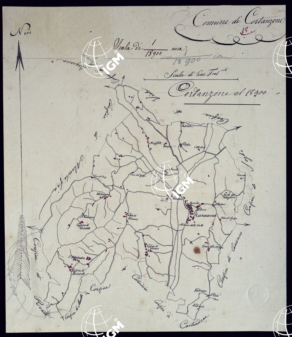 Il titolo non è presente sulla carta. Gruppo di 51 mappe catastali di diversi comuni, impiegate con tutta probabilità per la costruzione della carta generale degli Stati Sardi al 50.000. Senza firma, eccetto due, firmate da Lagrange, una riduzione del piano catastale del territorio d’Ivrea firmato Valsecchi 1822, e una riproduzione dei piani catastali di comuni della provincia d’Ivrea firmata Cap. Roggero.