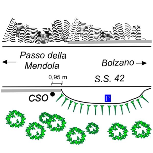[{"simbolo_contrassegno":"B1","materializzazione":"(CSO) – Bullone infisso all'esterno del muro di sostegno in c.a. del guard rail, in prossimit\u00e0 della testata del muro volta verso Bolzano."}]