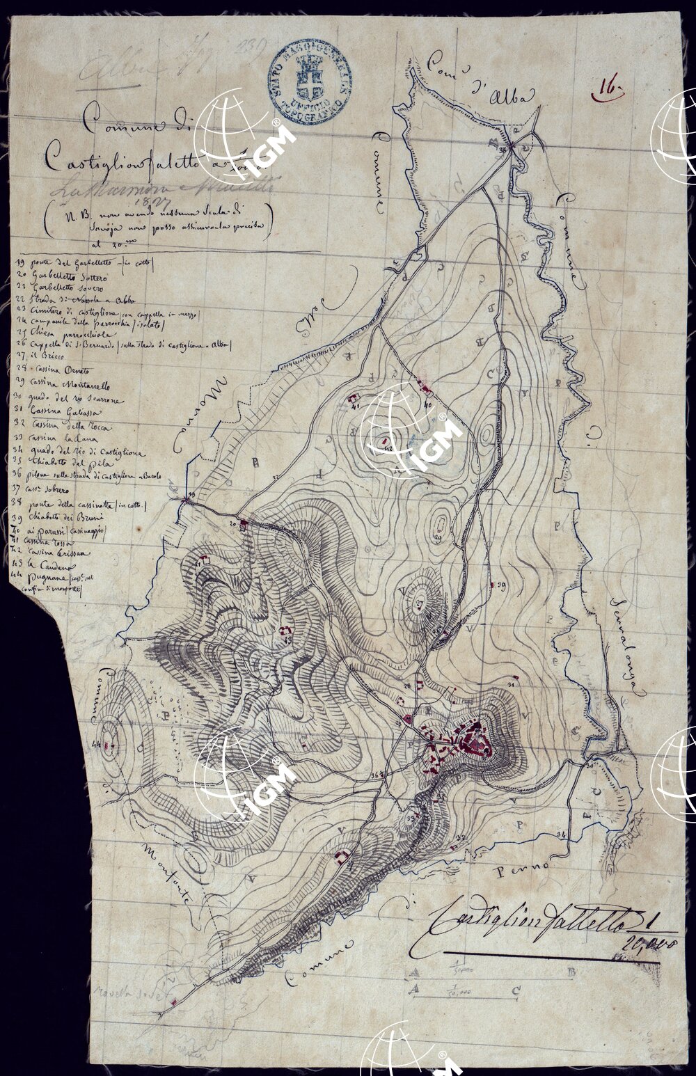 Il titolo non è presente sulla carta. Gruppo di 51 mappe catastali di diversi comuni, impiegate con tutta probabilità per la costruzione della carta generale degli Stati Sardi al 50.000. Senza firma, eccetto due, firmate da Lagrange, una riduzione del piano catastale del territorio d’Ivrea firmato Valsecchi 1822, e una riproduzione dei piani catastali di comuni della provincia d’Ivrea firmata Cap. Roggero.