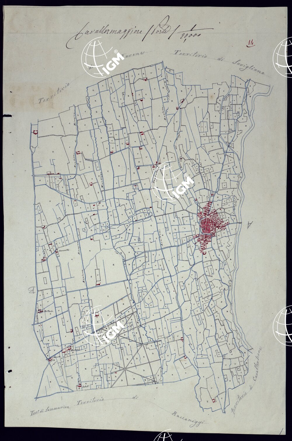 Il titolo non è presente sulla carta. Gruppo di 51 mappe catastali di diversi comuni, impiegate con tutta probabilità per la costruzione della carta generale degli Stati Sardi al 50.000. Senza firma, eccetto due, firmate da Lagrange, una riduzione del piano catastale del territorio d’Ivrea firmato Valsecchi 1822, e una riproduzione dei piani catastali di comuni della provincia d’Ivrea firmata Cap. Roggero.