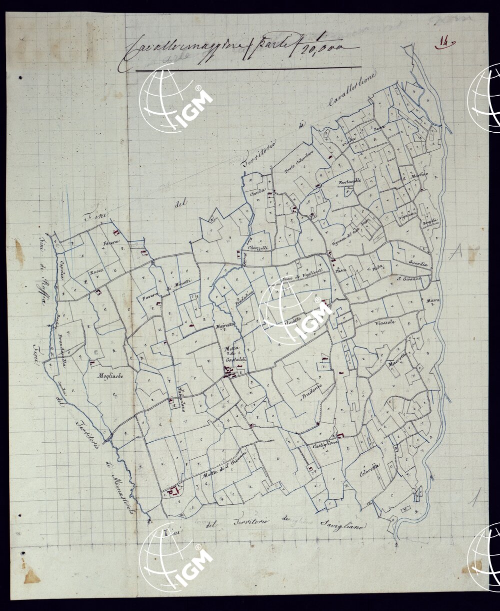 Il titolo non è presente sulla carta. Gruppo di 51 mappe catastali di diversi comuni, impiegate con tutta probabilità per la costruzione della carta generale degli Stati Sardi al 50.000. Senza firma, eccetto due, firmate da Lagrange, una riduzione del piano catastale del territorio d’Ivrea firmato Valsecchi 1822, e una riproduzione dei piani catastali di comuni della provincia d’Ivrea firmata Cap. Roggero.