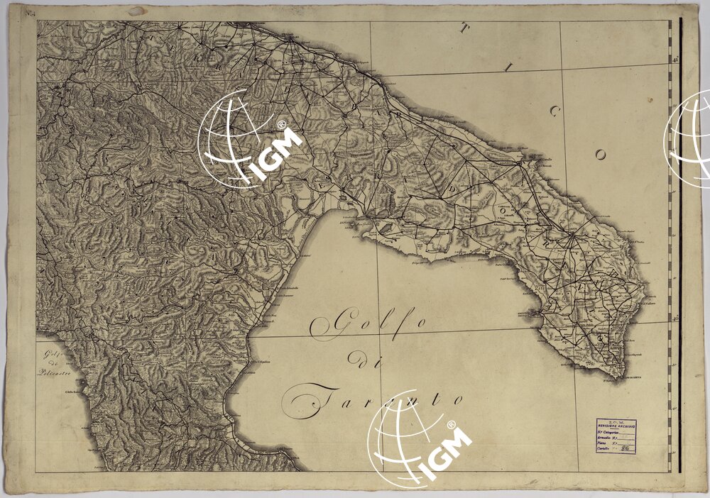 Carta in sei fogli tratta da incisione su rame, stampati in nero. Orografia dimostrata a mezzo di tratteggio. Il foglio n. 2 contiene il titolo e la legenda dei segni convenzionali per i confini (di stato, di provincie, di distretti, di circondari) e per le strade (costruite, in costruzione, ferrovie). Sotto al titolo (foglio n. 2) è scritto: “Aless.o d’Anna inc., e del ” e ” Gius. Azzerboni inc.”. Il foglio n. 5 reca due scale grafiche calcolate in miglia italiane e in leghe di Francia e in basso a sinistra la firma ” Vincenzo Aloja sculp.”