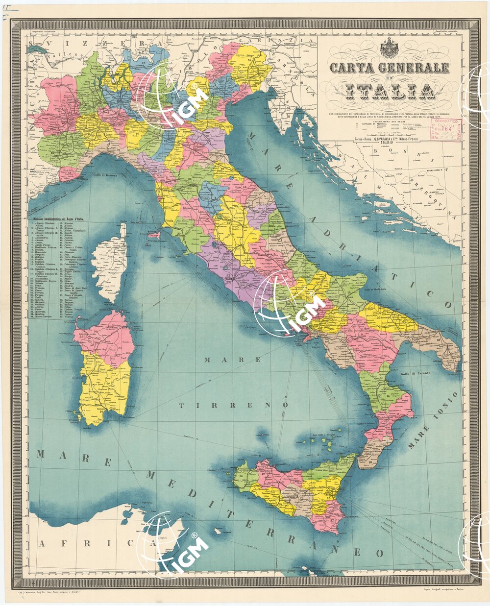 Rappresentazione orografica planimetrica. Sotto al titolo vi è la spiegazione dei segni, sulla sinistra della carta la divisione amministrativa del Regno d’Italia. Cav. D. Marchisio Seg. Dir. Gen. Poste compose e disegnò; Doyen Litografi eseguirono, Torino.