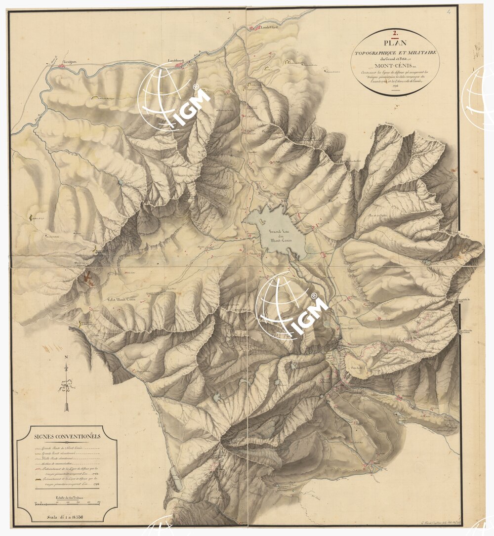 | Titolo proprio | PLAN TOPOGRAPHIQUE ET MILITAIRE DU GRAND ET PETIT MONT- CENIS CONTENANT LES LIGNES DE DEFENSE QU'OCCUPERENT LES TROUPES PIEMONTAISES, LA I.RE A' LA CAMPAGNE DE L'ANNEE 1744 ET LA 2.DE DANS CELLE DE' L'ANNEE 1794 |