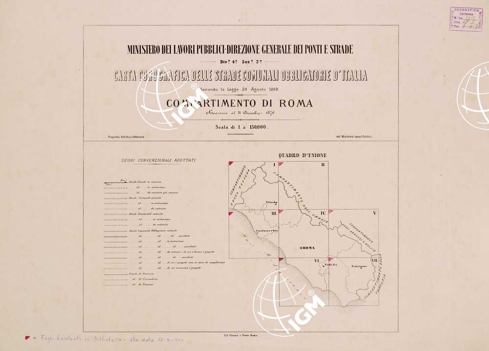 CARTA COROGRAFICA DELLE STRADE COMUNALI OBBLIGATORIE D’ITALIA – COMPARTIMENTO DI ROMA… – Quadro d’unione