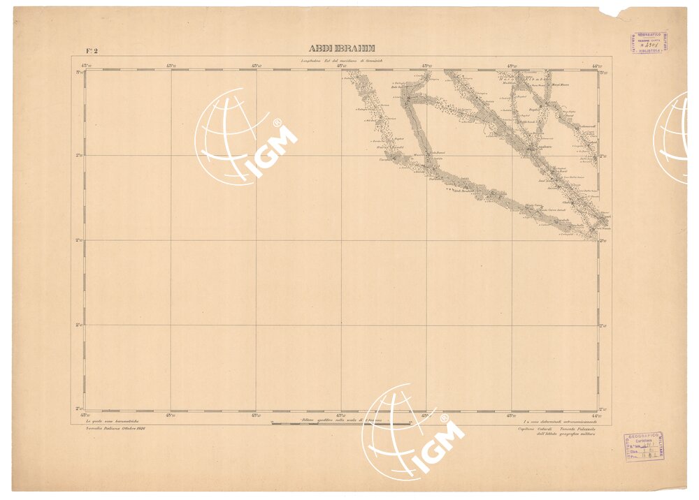 Sei fogli stampati in nero con orografia a curve dimostrative sussidiate da tratteggio (Foglio I); le quote sono barometriche. I titoli sono: 1) Iscia Baidoa; 2) Abdi Ibrahim; 3) Bur Hacaba; 4) Helo; 5) Uanle Uen; 6) Adalèi. Rilievi eseguiti dal Cap. Catardi e dal Ten. Palazzolo dell’I.G.M allo scopo di studiare il terreno per il tracciamento della ferrovia Adalèi-Baidoa.