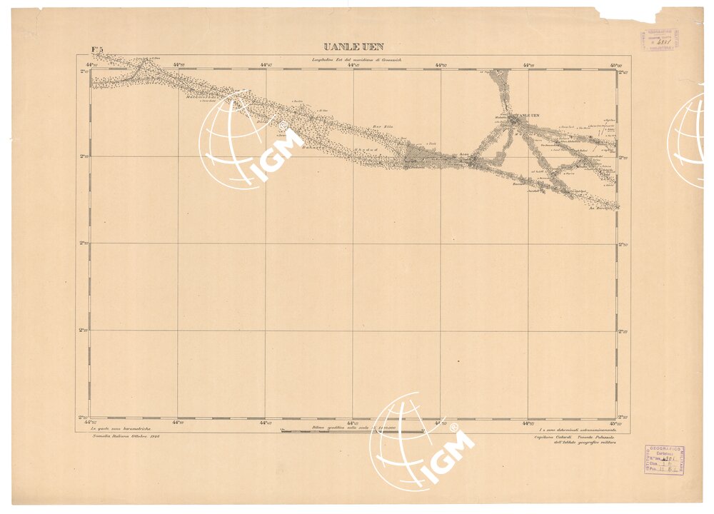 Sei fogli stampati in nero con orografia a curve dimostrative sussidiate da tratteggio (Foglio I); le quote sono barometriche. I titoli sono: 1) Iscia Baidoa; 2) Abdi Ibrahim; 3) Bur Hacaba; 4) Helo; 5) Uanle Uen; 6) Adalèi. Rilievi eseguiti dal Cap. Catardi e dal Ten. Palazzolo dell’I.G.M allo scopo di studiare il terreno per il tracciamento della ferrovia Adalèi-Baidoa.