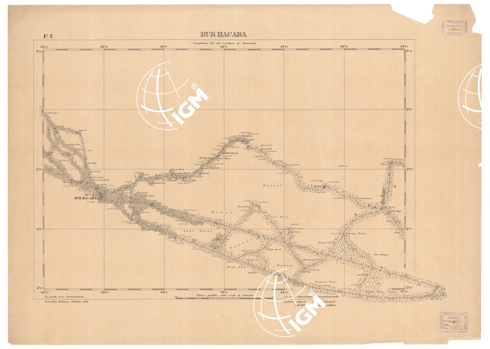 Sei fogli stampati in nero con orografia a curve dimostrative sussidiate da tratteggio (Foglio I); le quote sono barometriche. I titoli sono: 1) Iscia Baidoa; 2) Abdi Ibrahim; 3) Bur Hacaba; 4) Helo; 5) Uanle Uen; 6) Adalèi. Rilievi eseguiti dal Cap. Catardi e dal Ten. Palazzolo dell’I.G.M allo scopo di studiare il terreno per il tracciamento della ferrovia Adalèi-Baidoa.