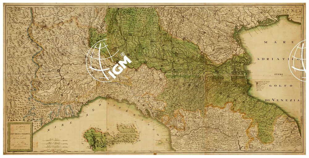 Carta in sei fogli riuniti e montati su tela. Incisione su rame. Orientazione normale. Longitudini derivate dal meridiano dell’Isola del Ferro. Orografia prospettica a monticelli. Abitati principali rappresentati schematicamente in pianta, gli altri con case e torri e distinti secondo la loro importanza. Sono pure distinti, con segni, gli arcivescovadi, i vescovadi e le università. Sono tracciate le principali strade.Territorio della Repubblica a fondo unito verde. Confini politici a colori. Quattro scale grafiche in miglia d’Italia, Piemonte, Francia e Germania.