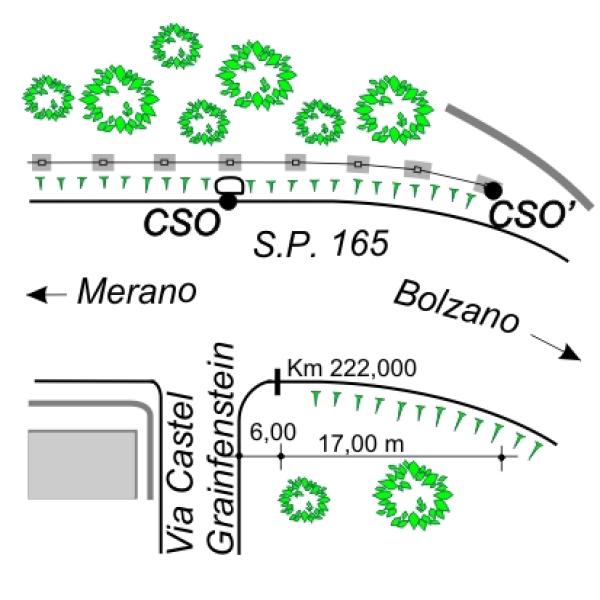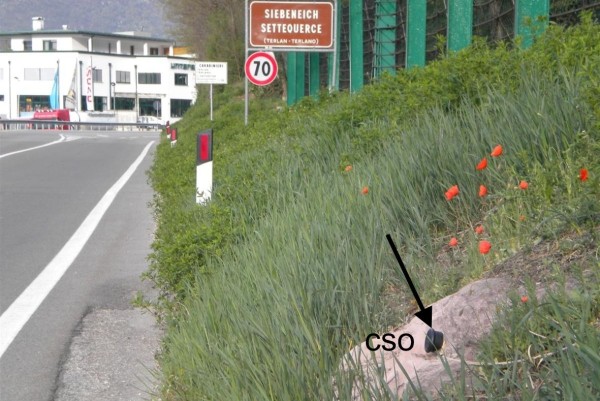 [{"simbolo_contrassegno":"B1","materializzazione":"(CSO) – Bullone infisso nel masso affiorante, a monte della strada, di fronte al bivio per via Castel Greifenstein"},{"simbolo_contrassegno":"B4","materializzazione":"(CSO') – Centrino universale Inox infisso sulla fondazione in cemento armato della rete protettiva caduta sassi, a monte della strada, testata volta verso Bolzano."}]