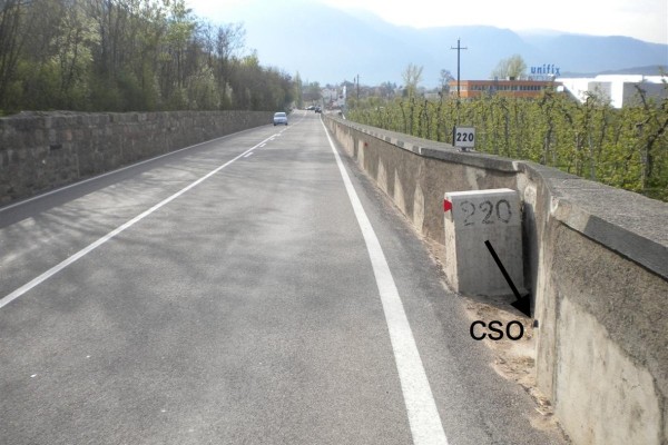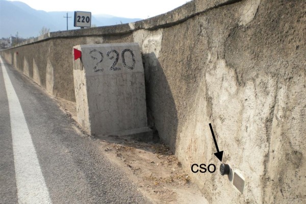 [{"simbolo_contrassegno":"B1","materializzazione":"(CSO) – Bullone infisso nel muro in cemento armato a valle della strada, a destra del cippo chilometrico 220."}]