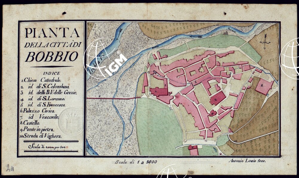 Accurata piantina della citta’ di Bobbio, firmata Antonio Losio. Il lavoro è stato probabilmente eseguito dal 1816 in poi.