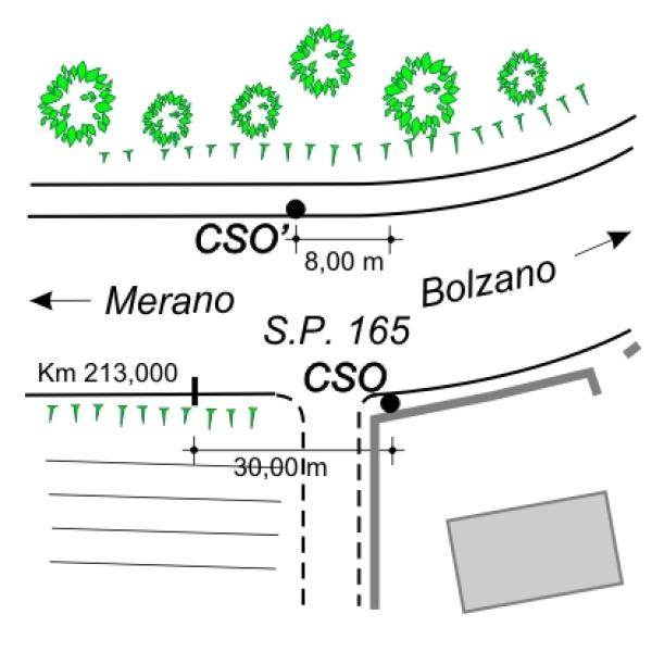 | Contrassegni | [{"simbolo_contrassegno":"B1","materializzazione":"(CSO) – Bullone infisso su di un muro di recinzione in cemento, 30 m prima della chilometrica 213, in prossimit\u00e0 dello spigolo di destra."},{"simbolo_contrassegno":"B7","materializzazione":"(CSO') – Centrino fiduciale del Catasto infisso sul bordo del marciapiede a monte della strada, 22 m circa prima della chilometrica 213."}] |
