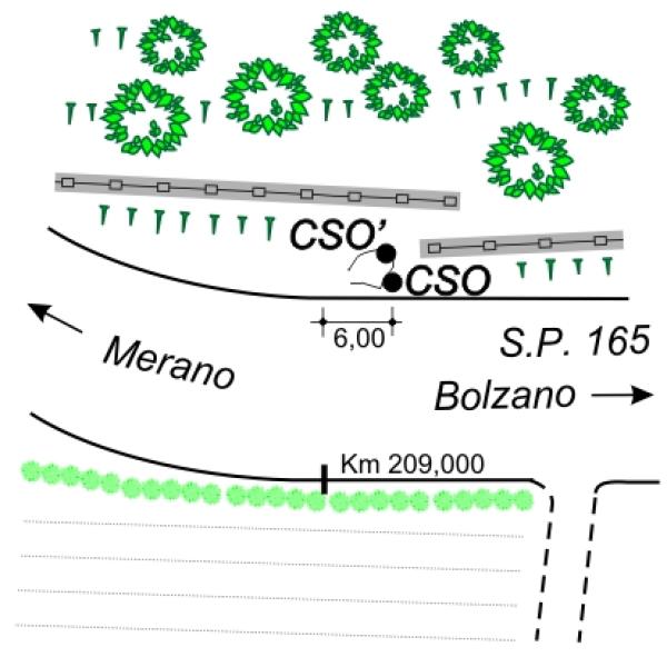 | Contrassegni | [{"simbolo_contrassegno":"B1","materializzazione":"(CSO) – Bullone infisso su di una roccia a monte della strada, di fronte alla chilometrica 209."},{"simbolo_contrassegno":"B4","materializzazione":"(CSO') – Centrino universale Inox Infisso su di una roccia a monte della strada, a 2 m circa di distanza dal CSO, a monte."}] |