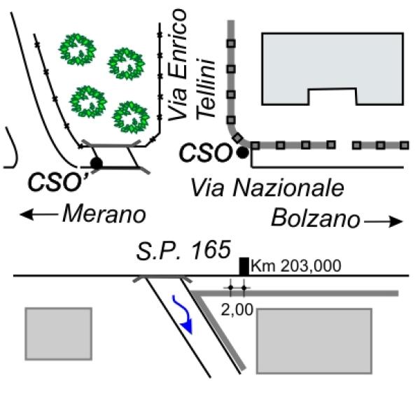 | Contrassegni | [{"simbolo_contrassegno":"B1","materializzazione":"(CSO) – Bullone infisso nel muro di recinzione, a sinistra dell'entrata al N\u00b0 Civ. 28, in prossimit\u00e0 dell'incrocio con via Enrico Tellini."},{"simbolo_contrassegno":"B7","materializzazione":"(CSO') – Centrino fiduciale del Catasto infisso sulla sommit\u00e0 del marciapiedi sopra un canale, a destra della strada, subito dopo il CSO, procedendo in direzione di Merano."}] |