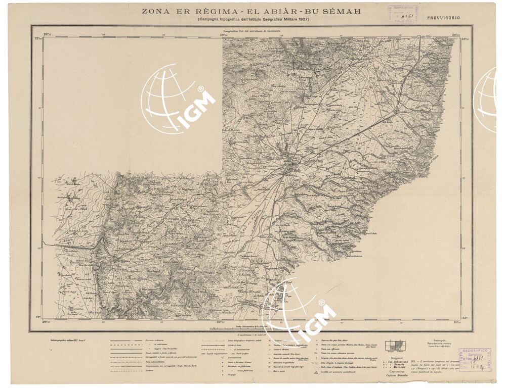 Questa carta è fondata sulle campagne annuali di operatori concessi dall’I.G.M. al Governo della Cirenaica (Ufficio Studi) che procede al rilevamento del territorio stesso. Per la compilazione si sono incorporati anche i rilievi eseguiti dal 1919 in poi dall’I.G.M. (pubblicati alla scala di 1:50.000, ved. N° 16 d’ordine, N. 2454 d’inventario) per la fascia costiera da Bengasi a oltre Derna e nell’interno per una quarantina di km. Tali rilievi sono gradualmente ridotti e inquadrati nei fogli al 1:100.000 comprendenti 30′ di longitudine per 20′ di latitudine: il lavoro di ridisegno selezione e aggiornamento è fatto presso 1/Ufficio Studi; la riduzione è fatta presso l’I.G.M. con sistema fotomeccanico. Le direttive per i rilievi sono date volta volta dall’Ufficio Studi del Governo che stabilisce la forma definitiva della toponomastica italiana e araba in base alle Norme emanate dal Ministero delle Colonie con Decreto I febbraio 1915. Ogni foglio è accompagnato dall’indice bilingue dei nomi contenuti. La carta viene stampata in nero. Le forme del rilievo sono rappresentate con curve di livello tracciate all’equidistanza di 10 metri. Le curve batometriche sono dedotte dagli scandagli della R. Marina. La carta mostra le ferrovie (ferrovia ordinaria, in costruzione, decauville), le strade (rotabile a fondo artificiale, carreggiabile a fondo naturale con parziali adattamenti, piste automobilistiche, comunicazioni non carreggiabili, sentiero) linee telegrafiche, limiti di stato e di commissariato, campi d’aviazione, zauie e moschee, marabutti (con fabbricato e senza), sinagoghe, cimiteri (cristiani, mussulmani ed ebraici), antichità, rovine, abitazioni trogloditiche, cisterne, pozzi e sorgenti, le zone allagate in periodo di piogge, gli uàdi, le località ove avvennero combattimenti, ecc.