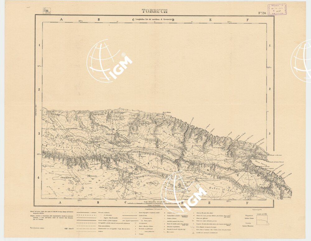 Questa carta è fondata sulle campagne annuali di operatori concessi dall’I.G.M. al Governo della Cirenaica (Ufficio Studi) che procede al rilevamento del territorio stesso. Per la compilazione si sono incorporati anche i rilievi eseguiti dal 1919 in poi dall’I.G.M. (pubblicati alla scala di 1:50.000, ved. N° 16 d’ordine, N. 2454 d’inventario) per la fascia costiera da Bengasi a oltre Derna e nell’interno per una quarantina di km. Tali rilievi sono gradualmente ridotti e inquadrati nei fogli al 1:100.000 comprendenti 30′ di longitudine per 20′ di latitudine: il lavoro di ridisegno selezione e aggiornamento è fatto presso 1/Ufficio Studi; la riduzione è fatta presso l’I.G.M. con sistema fotomeccanico. Le direttive per i rilievi sono date volta volta dall’Ufficio Studi del Governo che stabilisce la forma definitiva della toponomastica italiana e araba in base alle Norme emanate dal Ministero delle Colonie con Decreto I febbraio 1915. Ogni foglio è accompagnato dall’indice bilingue dei nomi contenuti. La carta viene stampata in nero. Le forme del rilievo sono rappresentate con curve di livello tracciate all’equidistanza di 10 metri. Le curve batometriche sono dedotte dagli scandagli della R. Marina. La carta mostra le ferrovie (ferrovia ordinaria, in costruzione, decauville), le strade (rotabile a fondo artificiale, carreggiabile a fondo naturale con parziali adattamenti, piste automobilistiche, comunicazioni non carreggiabili, sentiero) linee telegrafiche, limiti di stato e di commissariato, campi d’aviazione, zauie e moschee, marabutti (con fabbricato e senza), sinagoghe, cimiteri (cristiani, mussulmani ed ebraici), antichità, rovine, abitazioni trogloditiche, cisterne, pozzi e sorgenti, le zone allagate in periodo di piogge, gli uàdi, le località ove avvennero combattimenti, ecc.