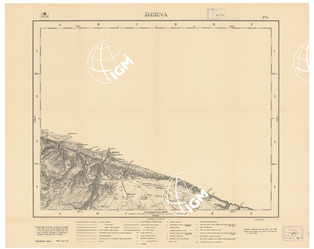 Questa carta è fondata sulle campagne annuali di operatori concessi dall’I.G.M. al Governo della Cirenaica (Ufficio Studi) che procede al rilevamento del territorio stesso. Per la compilazione si sono incorporati anche i rilievi eseguiti dal 1919 in poi dall’I.G.M. (pubblicati alla scala di 1:50.000, ved. N° 16 d’ordine, N. 2454 d’inventario) per la fascia costiera da Bengasi a oltre Derna e nell’interno per una quarantina di km. Tali rilievi sono gradualmente ridotti e inquadrati nei fogli al 1:100.000 comprendenti 30′ di longitudine per 20′ di latitudine: il lavoro di ridisegno selezione e aggiornamento è fatto presso 1/Ufficio Studi; la riduzione è fatta presso l’I.G.M. con sistema fotomeccanico. Le direttive per i rilievi sono date volta volta dall’Ufficio Studi del Governo che stabilisce la forma definitiva della toponomastica italiana e araba in base alle Norme emanate dal Ministero delle Colonie con Decreto I febbraio 1915. Ogni foglio è accompagnato dall’indice bilingue dei nomi contenuti. La carta viene stampata in nero. Le forme del rilievo sono rappresentate con curve di livello tracciate all’equidistanza di 10 metri. Le curve batometriche sono dedotte dagli scandagli della R. Marina. La carta mostra le ferrovie (ferrovia ordinaria, in costruzione, decauville), le strade (rotabile a fondo artificiale, carreggiabile a fondo naturale con parziali adattamenti, piste automobilistiche, comunicazioni non carreggiabili, sentiero) linee telegrafiche, limiti di stato e di commissariato, campi d’aviazione, zauie e moschee, marabutti (con fabbricato e senza), sinagoghe, cimiteri (cristiani, mussulmani ed ebraici), antichità, rovine, abitazioni trogloditiche, cisterne, pozzi e sorgenti, le zone allagate in periodo di piogge, gli uàdi, le località ove avvennero combattimenti, ecc.