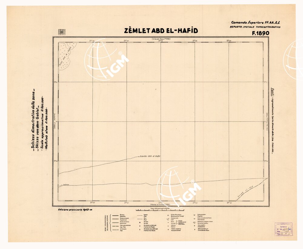 COMANDO SUPERIORE F.F.A.A. REPARTO SPECIALE TOPOCARTOGRAFICO. Ingrandimento Carta dimostrativa della Libia 1:400.000 rielevamento della costa eseguito dalla R. Marina tracciato della Via Balbia dell’Ufficio Spec.le della Strada. Itinerari vari eseguiti da topografi dell’I.G.M. determinazioni astronomiche speditive e triangolazioni trigonometriche dell’I.G.M. e della R. Marina. Informazioni varie.