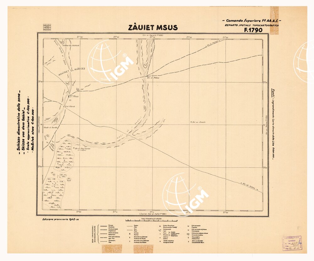 COMANDO SUPERIORE F.F.A.A. REPARTO SPECIALE TOPOCARTOGRAFICO. Ingrandimento Carta dimostrativa della Libia 1:400.000 rielevamento della costa eseguito dalla R. Marina tracciato della Via Balbia dell’Ufficio Spec.le della Strada. Itinerari vari eseguiti da topografi dell’I.G.M. determinazioni astronomiche speditive e triangolazioni trigonometriche dell’I.G.M. e della R. Marina. Informazioni varie.