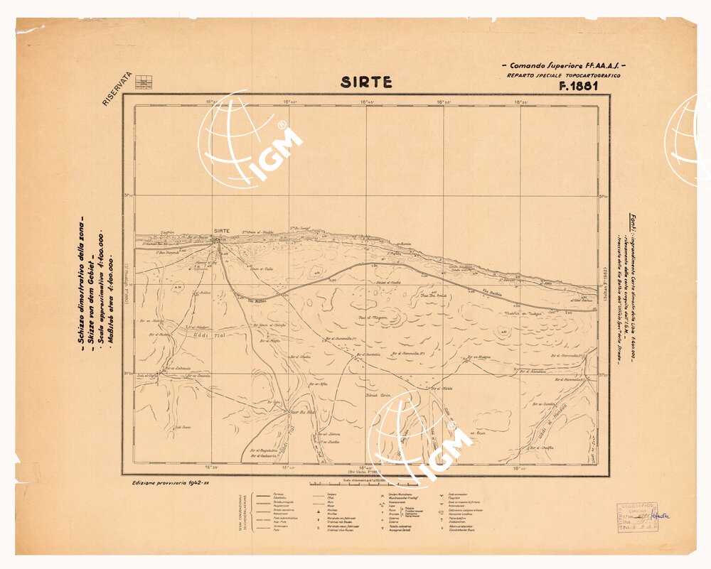 COMANDO SUPERIORE F.F.A.A. REPARTO SPECIALE TOPOCARTOGRAFICO. Ingrandimento Carta dimostrativa della Libia 1:400.000 rilevamento della costa eseguito dalla R. Marina tracciato della Via Balbia dell’Ufficio Spec.le della Strada. Itinerari vari eseguiti da topografi dell’I.G.M. determinazioni astronomiche speditive e traingolazioni trigonometriche dell’I.G.M. e della R. Marina. Informazioni varie.